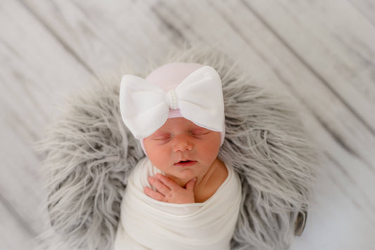 Pearl Chiffon Center White Bow and Pink White Striped Hat