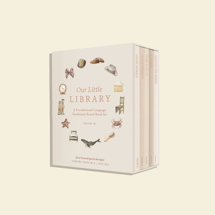 Designed by a professional watercolor artist and licensed speech therapist, Our Little Library Vol. 2 includes five new board books that feature charming watercolor illustrations and foundational first words that will help you build your child's vocabulary. The durable materials and small book size also make them perfect for your baby's little hands.