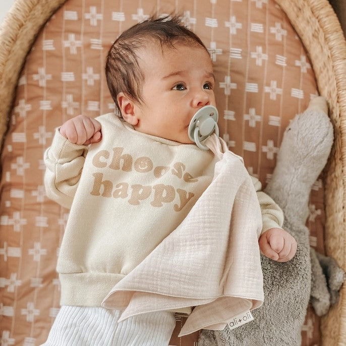 Our pacificer blanket holder is made from 100% ultra-soft muslin cotton that is delicate against your baby’s sensitive skin. It features a fabric loop with a led-free snap closure that easily attaches to your baby's pacifier or teether making it the perfect lovey blanket for your baby. It doubles as a security blanket that is the ideal size for cuddling.